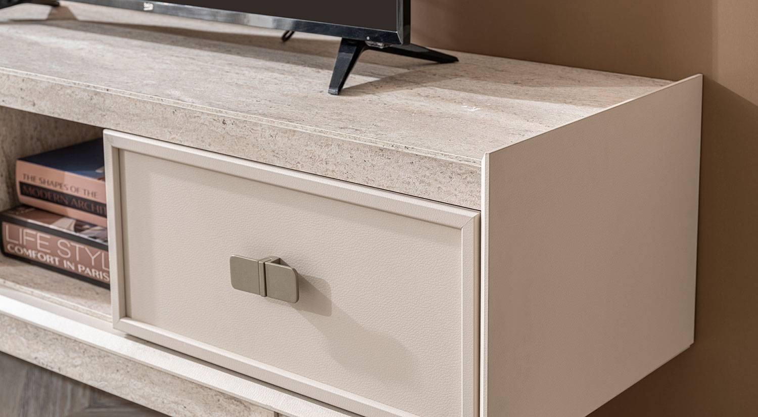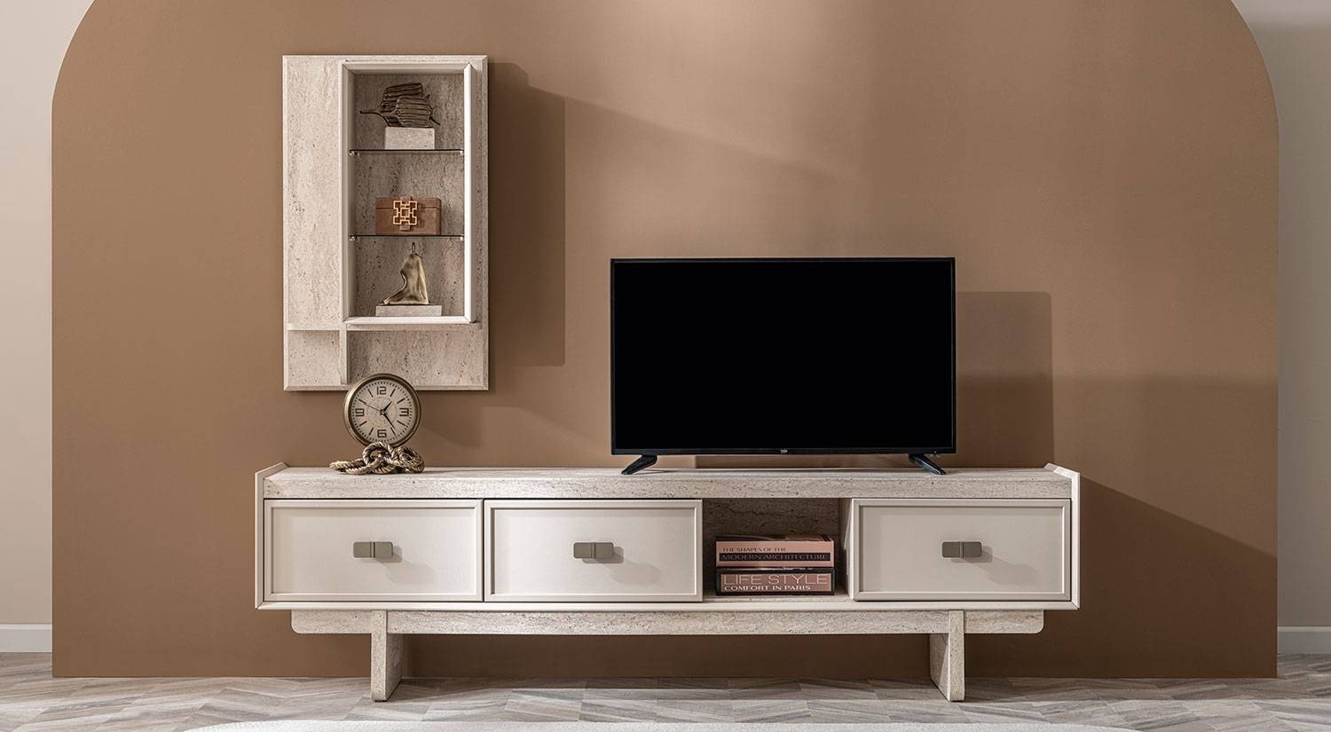 Alaska Duvar Ünitesi sade ve çağdaş çizgilere sahiptir. Krem renk paleti ve traverten izleri ile salonunuza sıcak, modern bir atmosfer kazandırır.