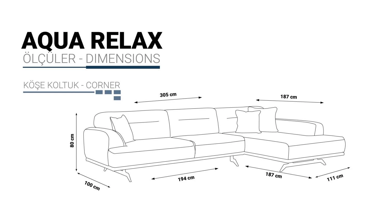 | Köşe Takımı (dıştan dışa) | 305 cm | 187 cm | 80 cm |