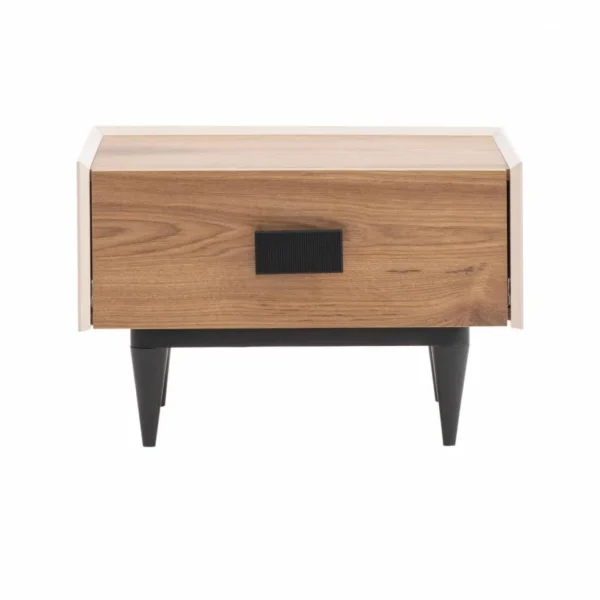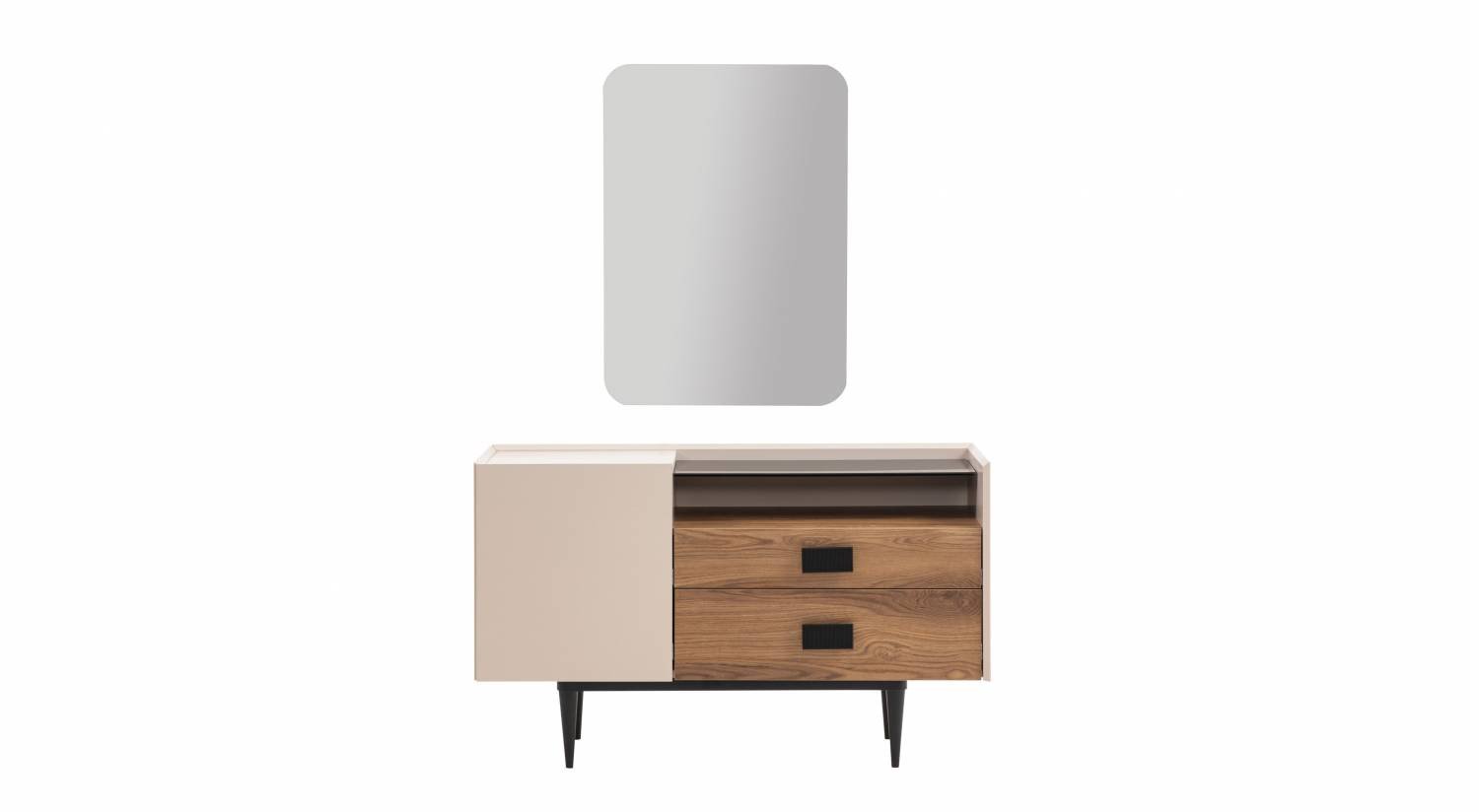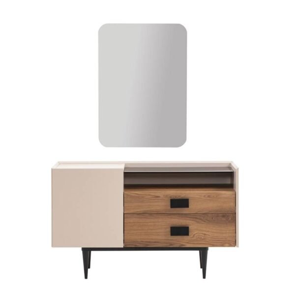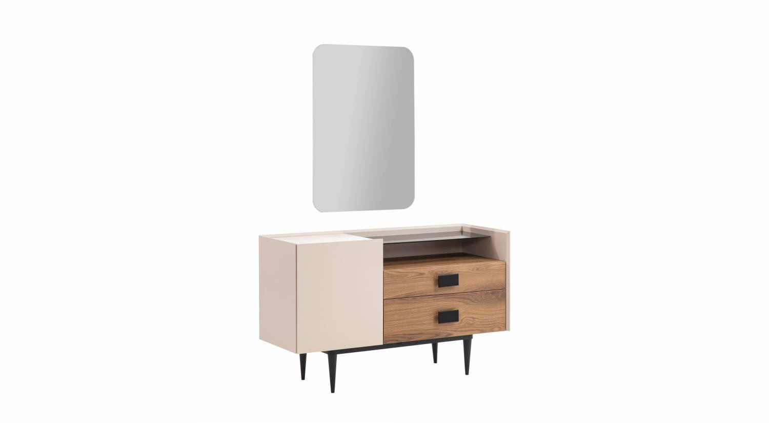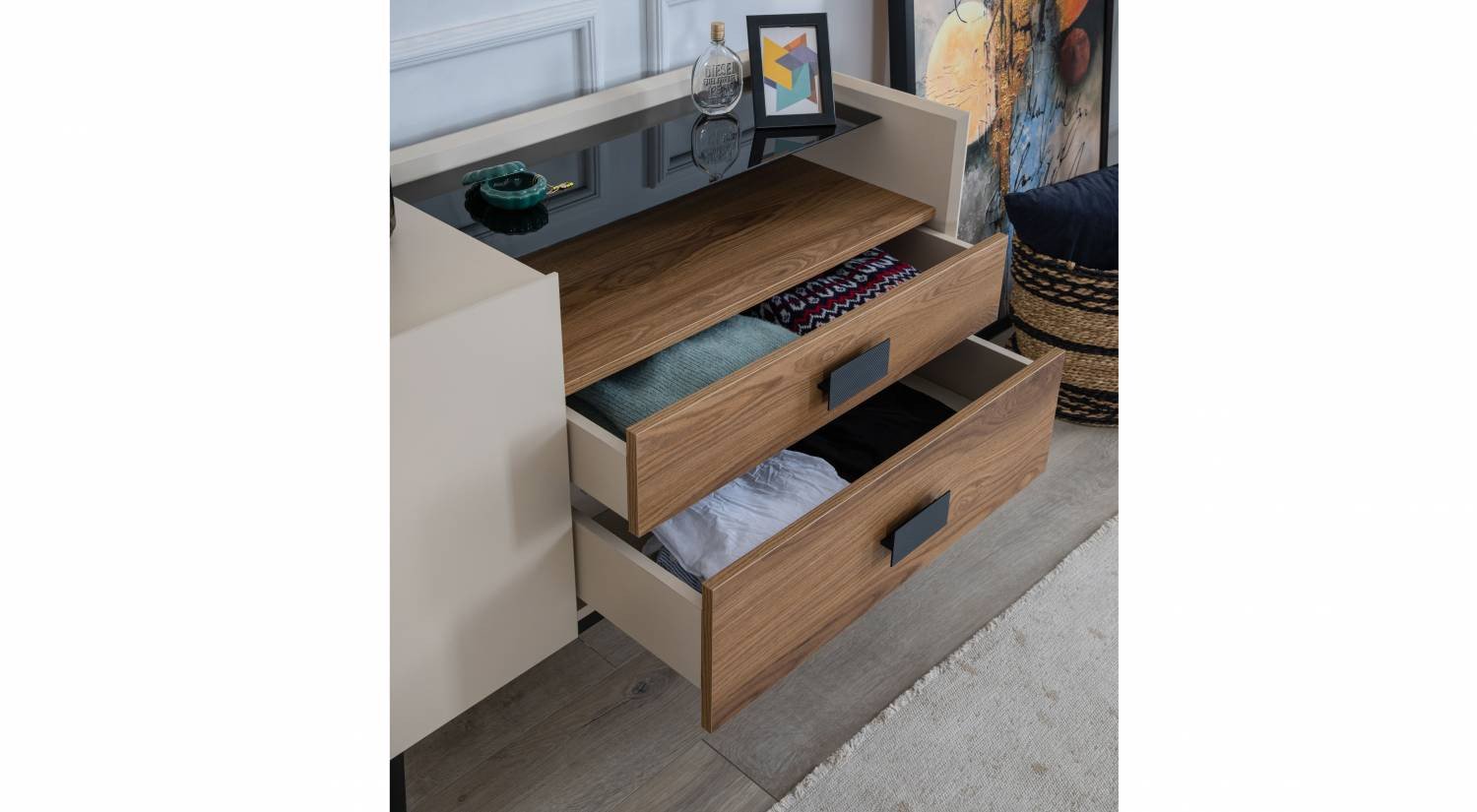 Dolap kapaklarında frenli menteşe sistemi, çekmecelerde teleskopik ray sistemi bulunur; bu da günlük kullanımda üstün konfor ve sessiz açılış-kapanış sağlar. Ahşap ayaklar ve metal bağlantı parçaları, takıma uzun ömürlü yapı kazandırır.