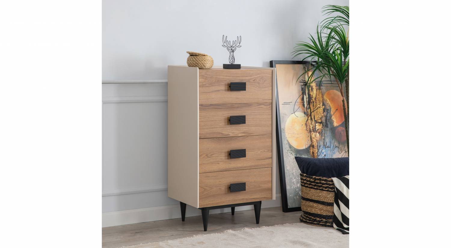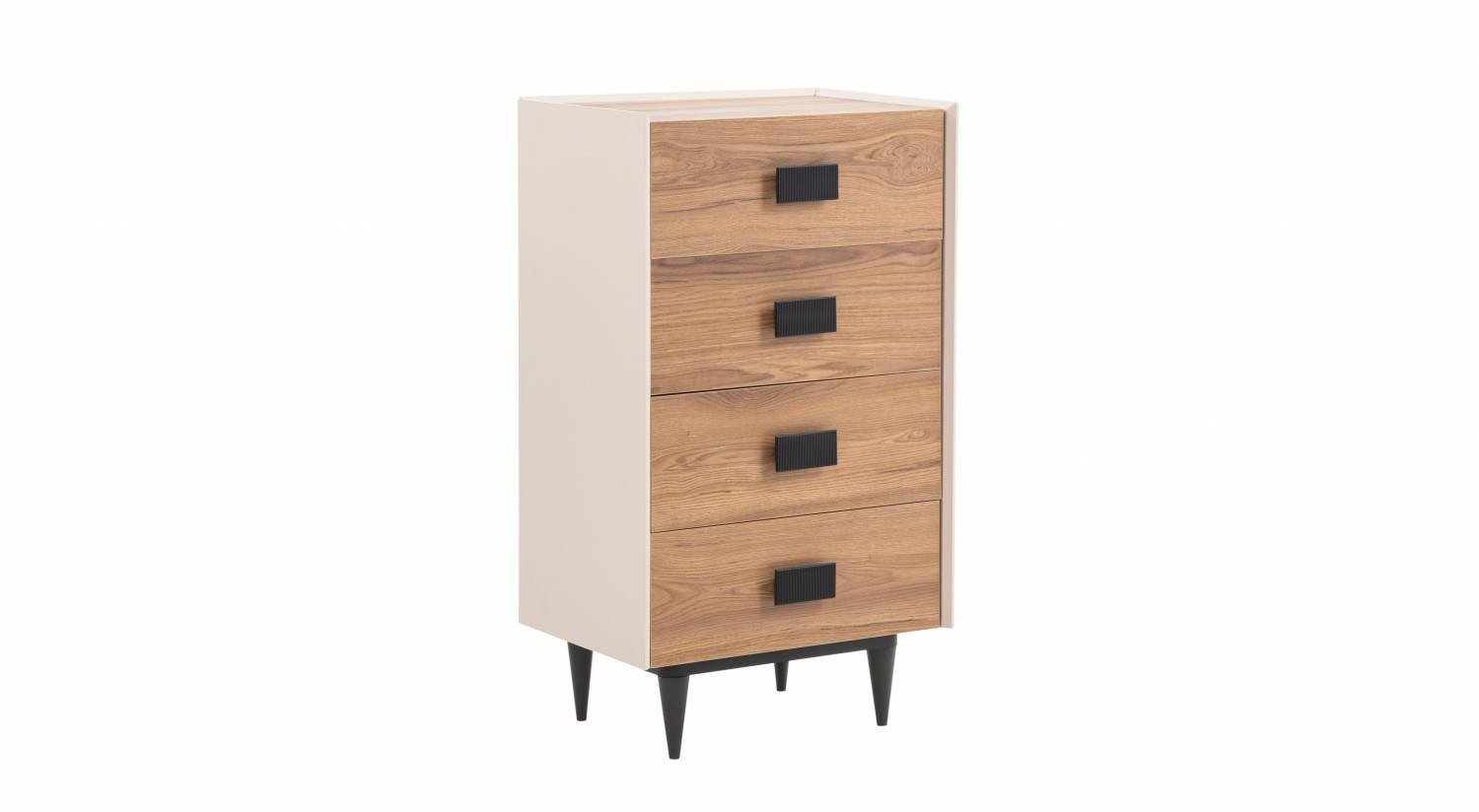 Takım, gardırop, bazalı karyola, başlık, şifonyer, komodin ve çamaşırlık gibi modüller sayesinde geniş depolama alanı sunar. Gardırop içindeki raf, askılık ve çekmeceler düzenli kullanım sağlar.