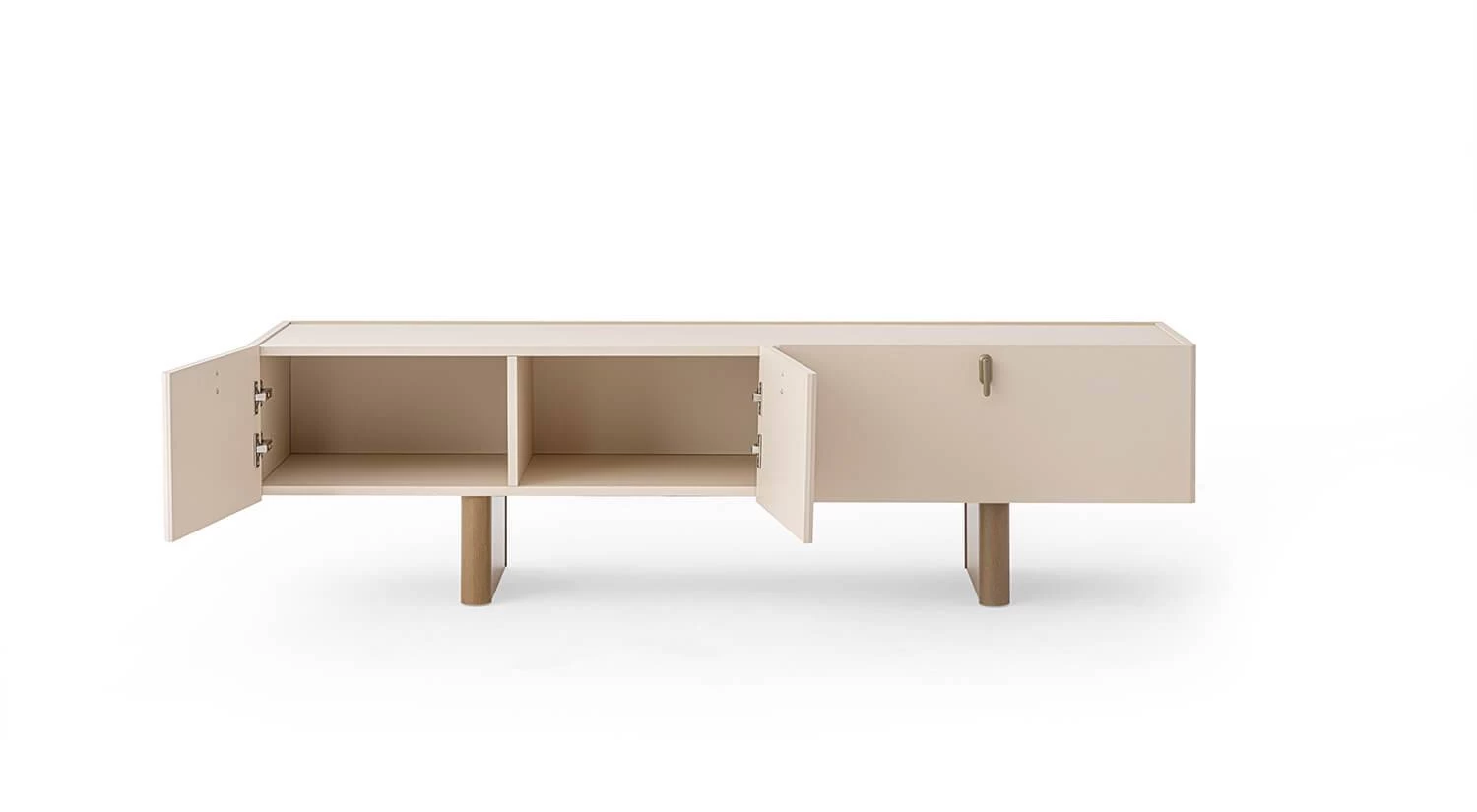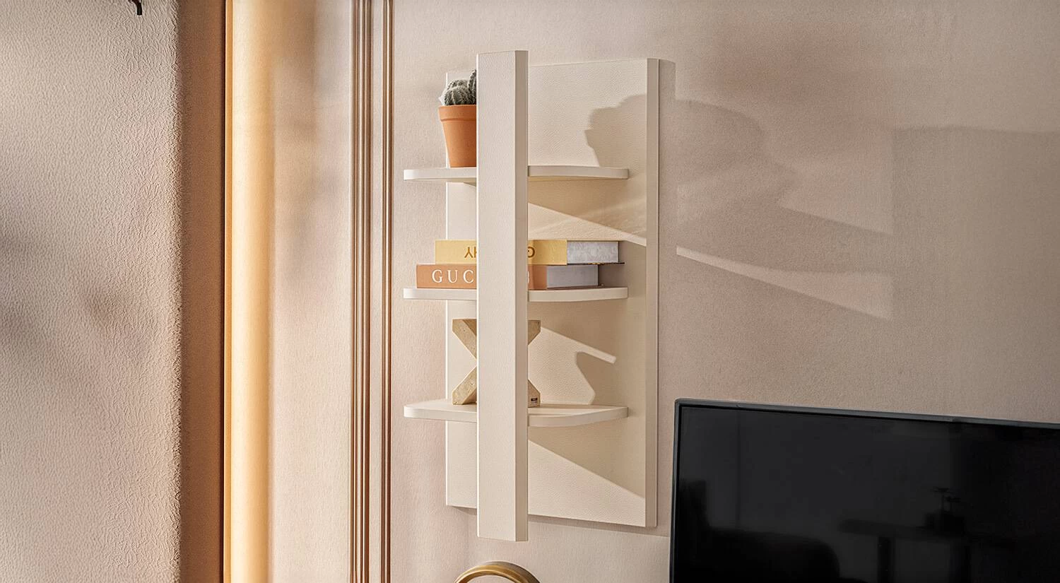 Üst bölümde çok raflı yapı dekoratif objeler, kitaplar ve elektronik aksesuarlar için ideal alanlar sunar. Alt blok geniş depolama alanı ile yaşam alanındaki düzeni artırır.