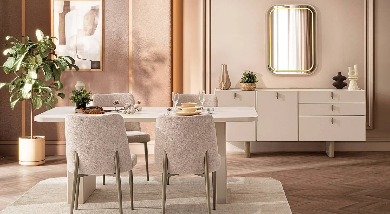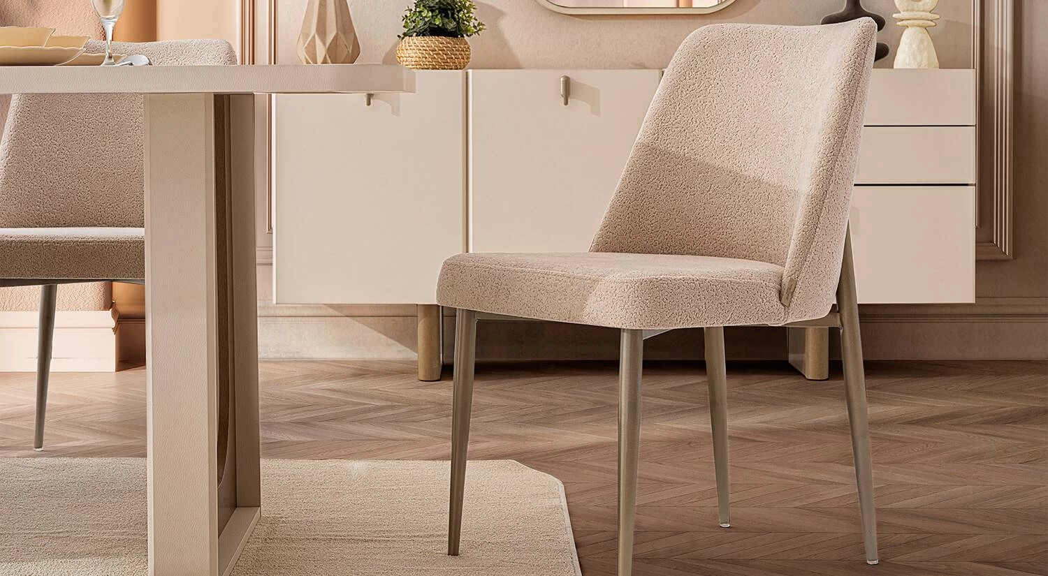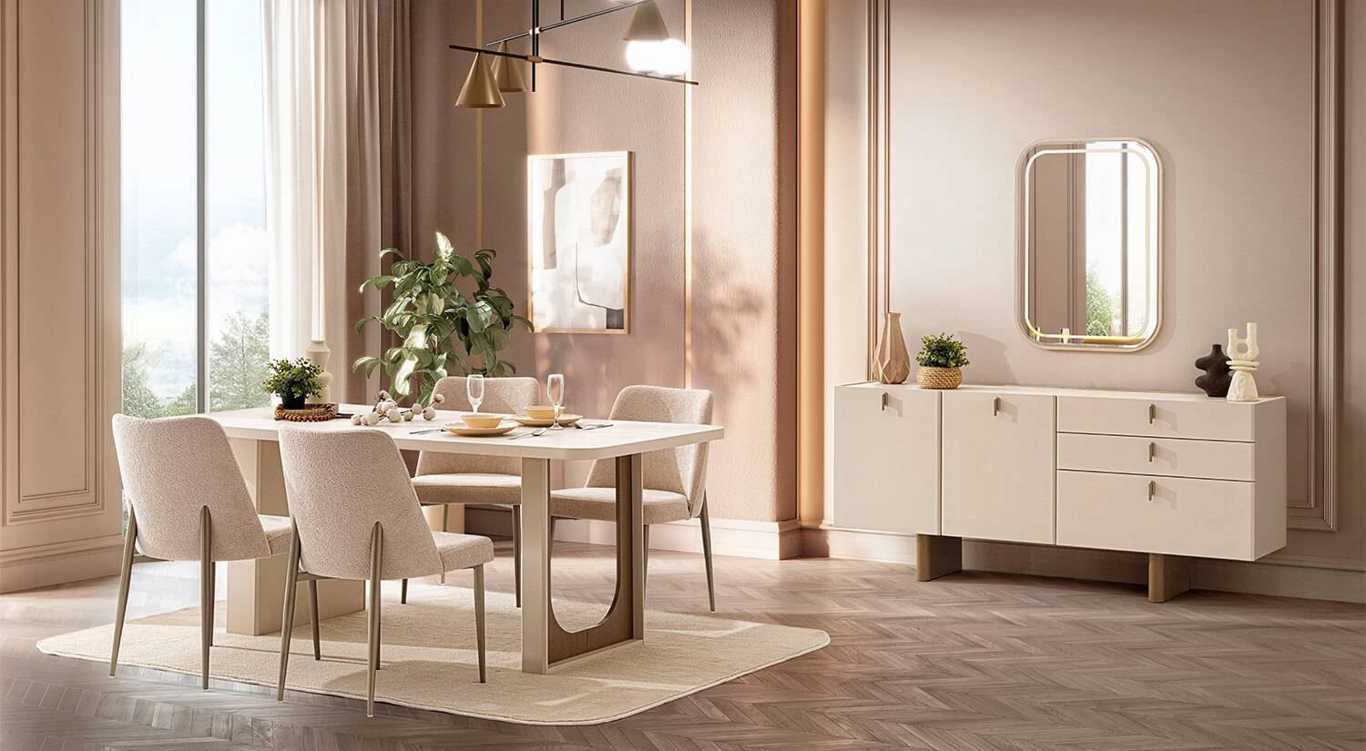 Atlas Yemek Odası sade ve akışkan hatlara sahip modern bir tasarım sunar. Bej ve doğal tonlar ile ferah bir atmosfer oluşmasına yardımcı olur.