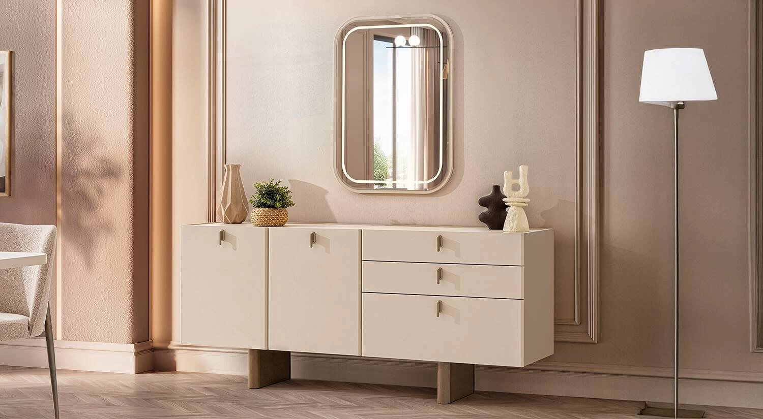 Takım; sabit yemek masası, modern konsol, dekoratif ayna ve şık sandalyelerden oluşur. Konsolda geniş depolama alanı bulunur.
