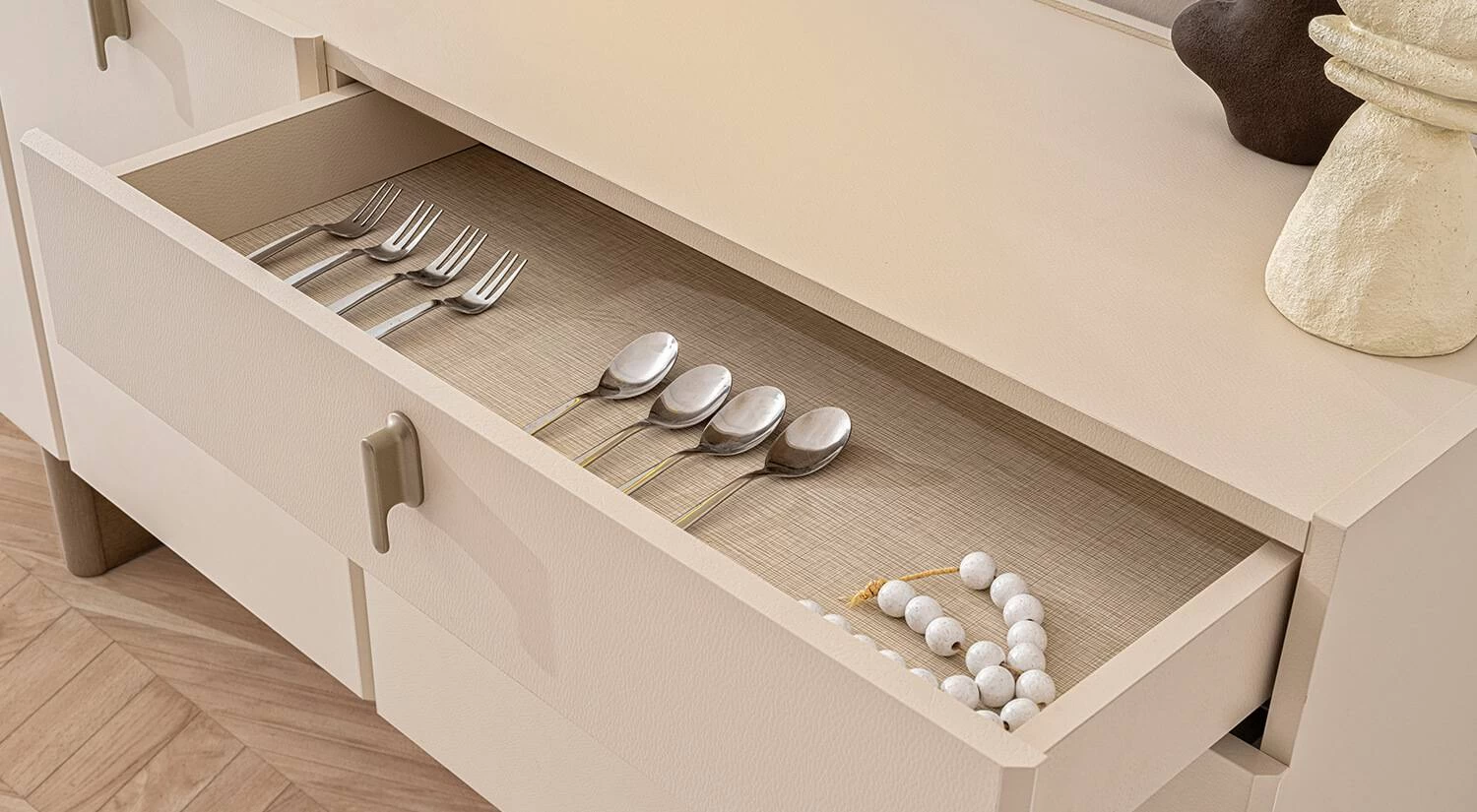 Çekmecelerde tandem raylar; kapaklarda yumuşak, sessiz kapanış sağlayan frenli menteşe sistemi kullanılır. Bu detaylar hem kullanım kolaylığı hem uzun ömür sağlar.