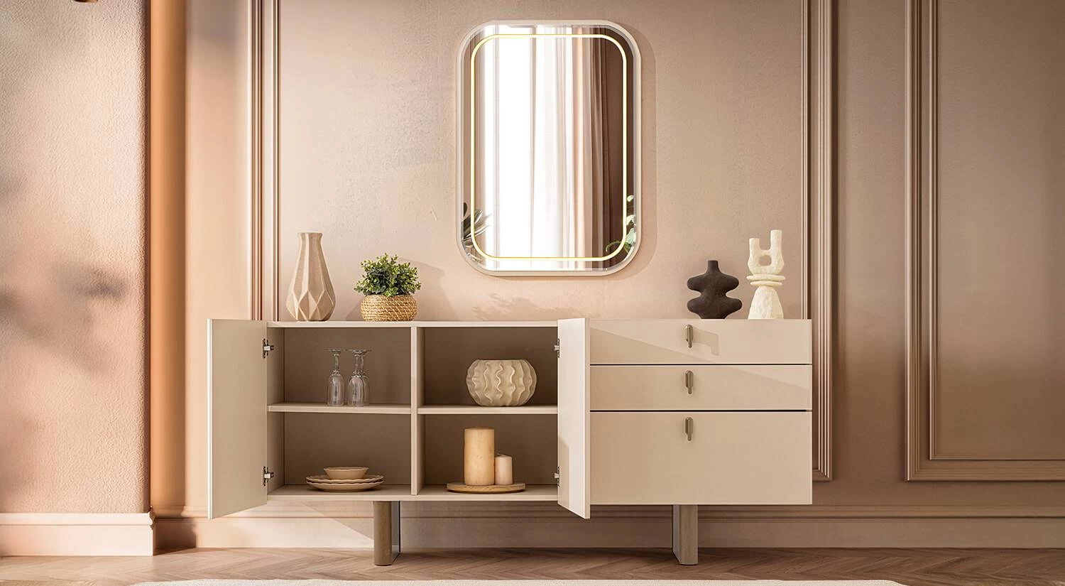Atlas Yemek Odası, modern ve zarif bir yemek alanı dekorasyonu arayan kullanıcılar için uygundur. Estetik detaylar ve fonksiyonel depolama çözümleri ile günlük yemek deneyimini keyifli ve düzenli hale getirir.
