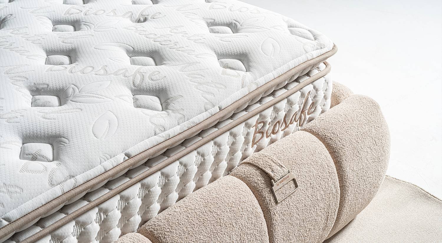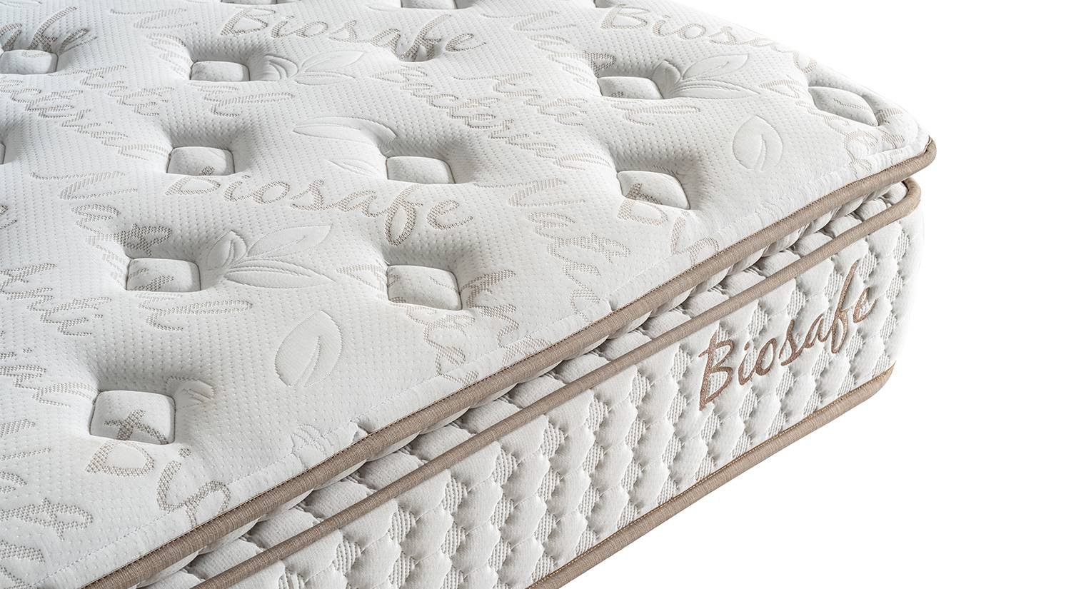 BioSafe yatak örme kumaşı, toz, bakteri ve toksinlerin barınmasını önleyerek temiz ve güvenli bir uyku alanı sağlar. Kumaş aynı zamanda nefes alabilen, hipoalerjenik bir yüzey sunar.