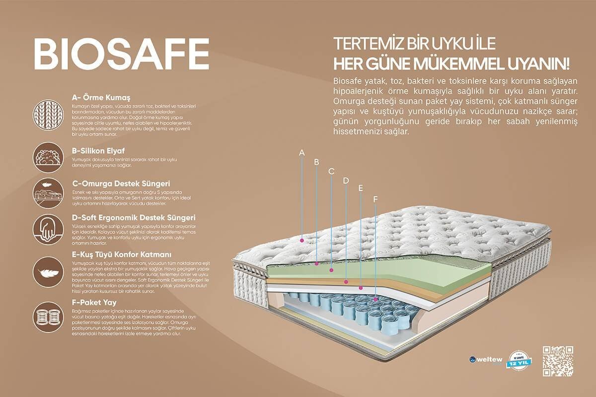 BioSafe Yatak, Baza ve Başlık Seti, temiz ve konforlu bir uyku deneyimi sunmak üzere tasarlanmış komple bir uyku çözümüdür. Toz, bakteri ve toksinlere karşı koruma sağlayabilen özel örme kumaşı sayesinde hijyenik bir uyku ortamı oluşturur. Paket yay sistemi, çok katmanlı sünger yapısı ve konfor katmanları ile hem vücudun omurga desteğini optimize eder hem de yumuşak bir uyku yüzeyi sağlar. Ürün ücretsiz montaj hizmeti ve 2 yıl kumaş/dolgu garantisi ile birlikte teslim edilir; paket yay sistemi için 10 yıl garanti avantajı sunar.