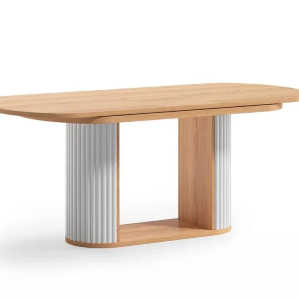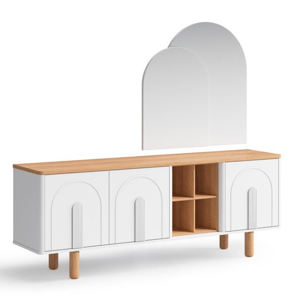 Takımda yer alan konsol geniş depolama alanı sunar ve yemek takımları ile servis gereçlerini düzenli saklama imkânı sağlar. Frenli menteşe donanımlı kapaklar, uzun ömürlü ve konforlu kullanım sağlar.