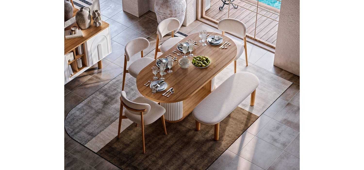 Sandalyeler ergonomik yapıdadır ve birlikte sunulan bench ile ek oturum alanı sağlar. Bu sayede hem konforlu hem de sosyal yemek anları için geniş oturma alanı oluşturur.