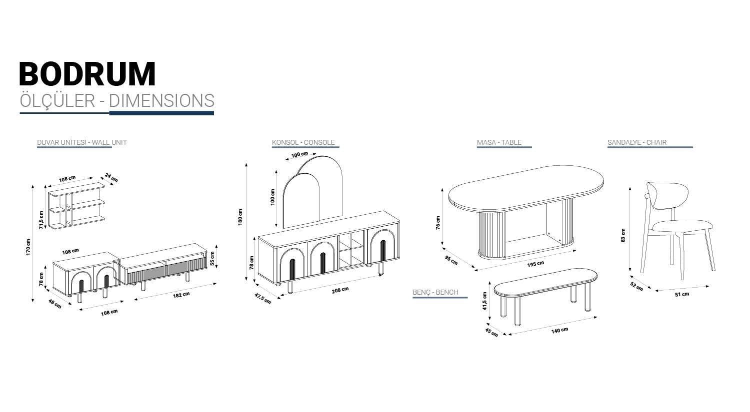 Bodrum Yemek Odası, bohem ve modern tasarım çizgilerini birleştiren şık bir yemek alanı çözümüdür. Ahşabın sıcak dokusunu modern detaylarla buluşturan bu takım, salon yemek alanlarında zarif ve ferah bir atmosfer oluşturur. Geniş modülleri, ergonomik sandalye tasarımı ve fonksiyonel kullanıma uygun depolama alanları ile hem günlük kullanımda hem de özel davetlerde konforlu bir yemek deneyimi sağlar.