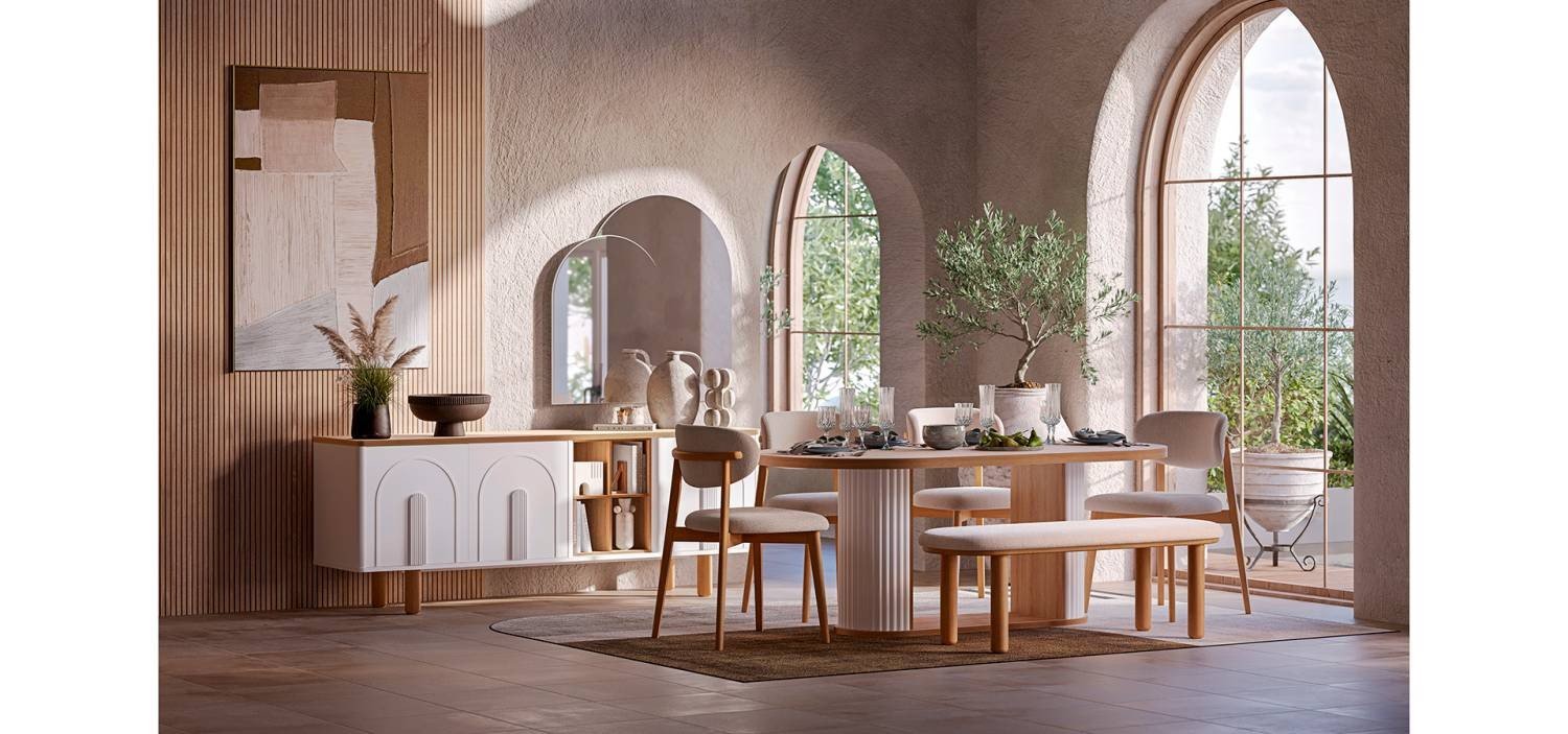 Bodrum Yemek Odası, bohem estetik ve fonksiyonel kullanım arayan kullanıcılar için uygundur. Ahşap detaylar ve modern çizgiler sayesinde sıcak ve sofistike bir yemek alanı sunar. Konsol, açılır masa ve bench kombinasyonlarıyla hem günlük yemeklerde hem de kalabalık misafir ağırlamalarında pratik çözümler sağlar.