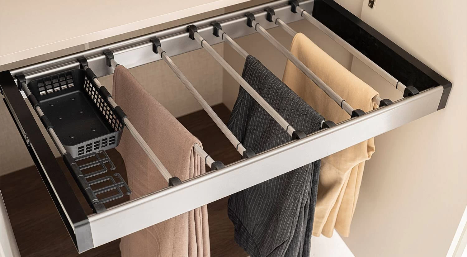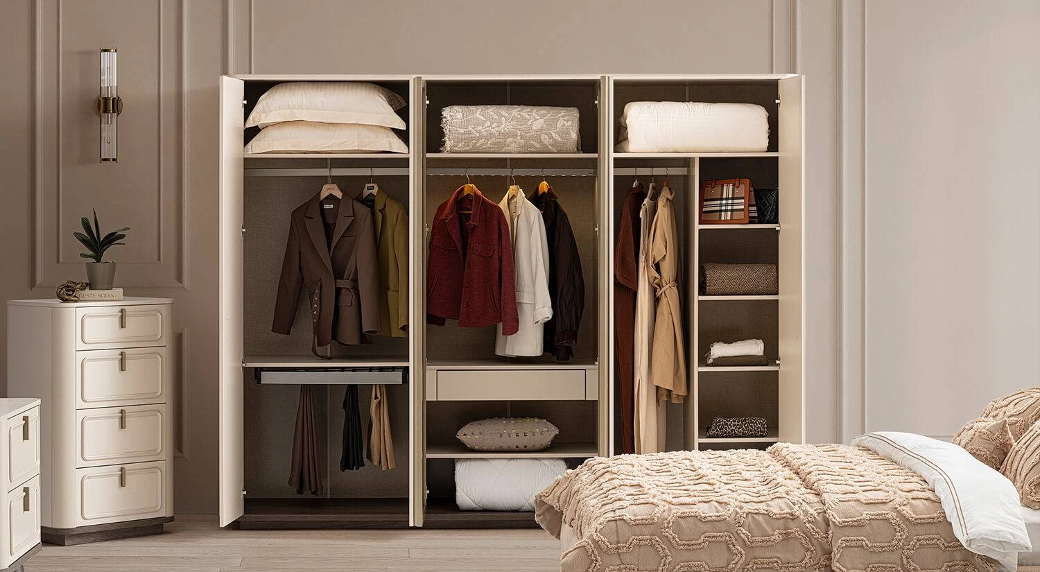 Gardrop geniş iç hacimli raflarla desteklenmiştir; dolap içi 1 adet çekmece, 2 adet alüminyum askılık ve sensörlü aydınlatmalı askılık içerir. Tüm kapaklarda kendinden frenli menteşe ve çekmecelerde frenli ray sistemi kullanılarak uzun ömürlü ve sessiz kullanım sağlanır.
