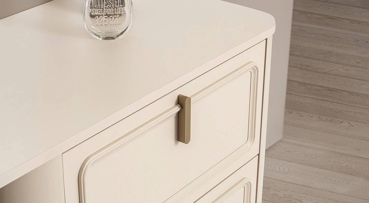 Takım, E1 standartlarına sahip 25 mm, 18 mm ve 8 mm kalınlıklarında melamin kaplı yonga levhadan üretilmiştir. Dolap kapakları ve çekmece önlerinde görsel uyum sağlayan döküm profiller bulunur. Başlık döşemesi strafor, sünger ve kumaş kaplama ile konforlu bir yapıda tasarlanmıştır; kulplar alüminyum metal malzemeden imal edilmiştir.