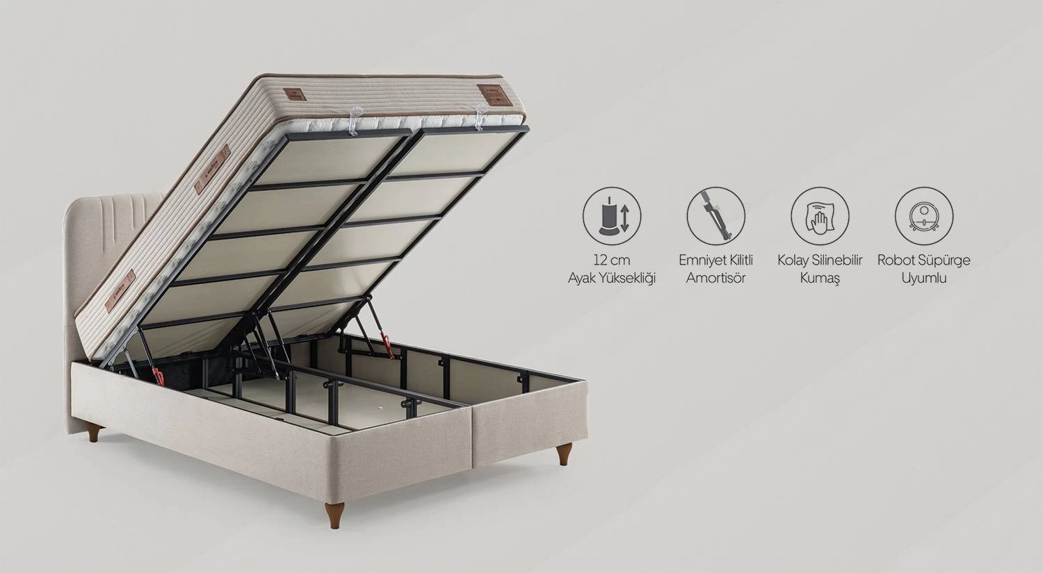 12 cm ayak yüksekliği, emniyet kilitli amortisör ve robot süpürge uyumluluğu gibi özellikler günlük kullanımı kolaylaştırır.