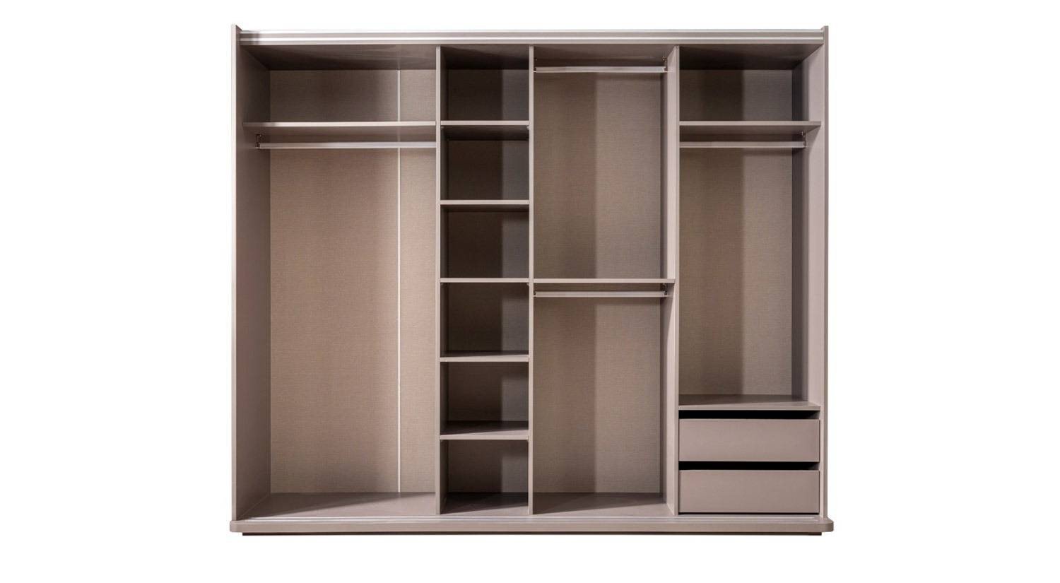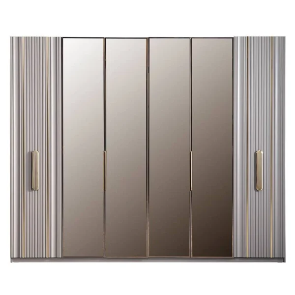 Gardropta çift taraflı yavaş kapanabilen sürgülü kapak sistemi, içinde raflar ve alüminyum askılık sistemleri yer alır. Çekmeceler teleskopik raylarla, kapaklar frenli menteşelerle donatılmıştır; bu sayede günlük kullanımda sessiz, rahat ve dayanıklı bir performans sunar.