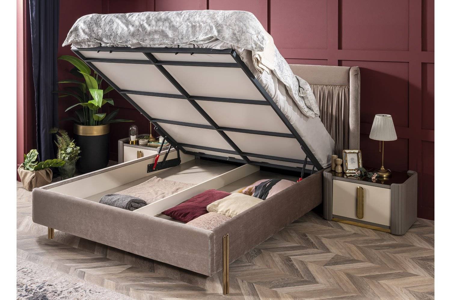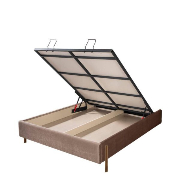 Karyola başlığı ve gövdesi melamin kaplı yonga levha üzerine strafor ve kumaş döşemesi ile üretilmiştir. Baza kapağı demir profilden imal edilmiştir; emniyet kilidi ve amortisörlü yapısı ile güvenli kullanım sağlar. Dolap dış kapaklarında altın yaldız plastik profiller estetik bir dokunuş sunar.