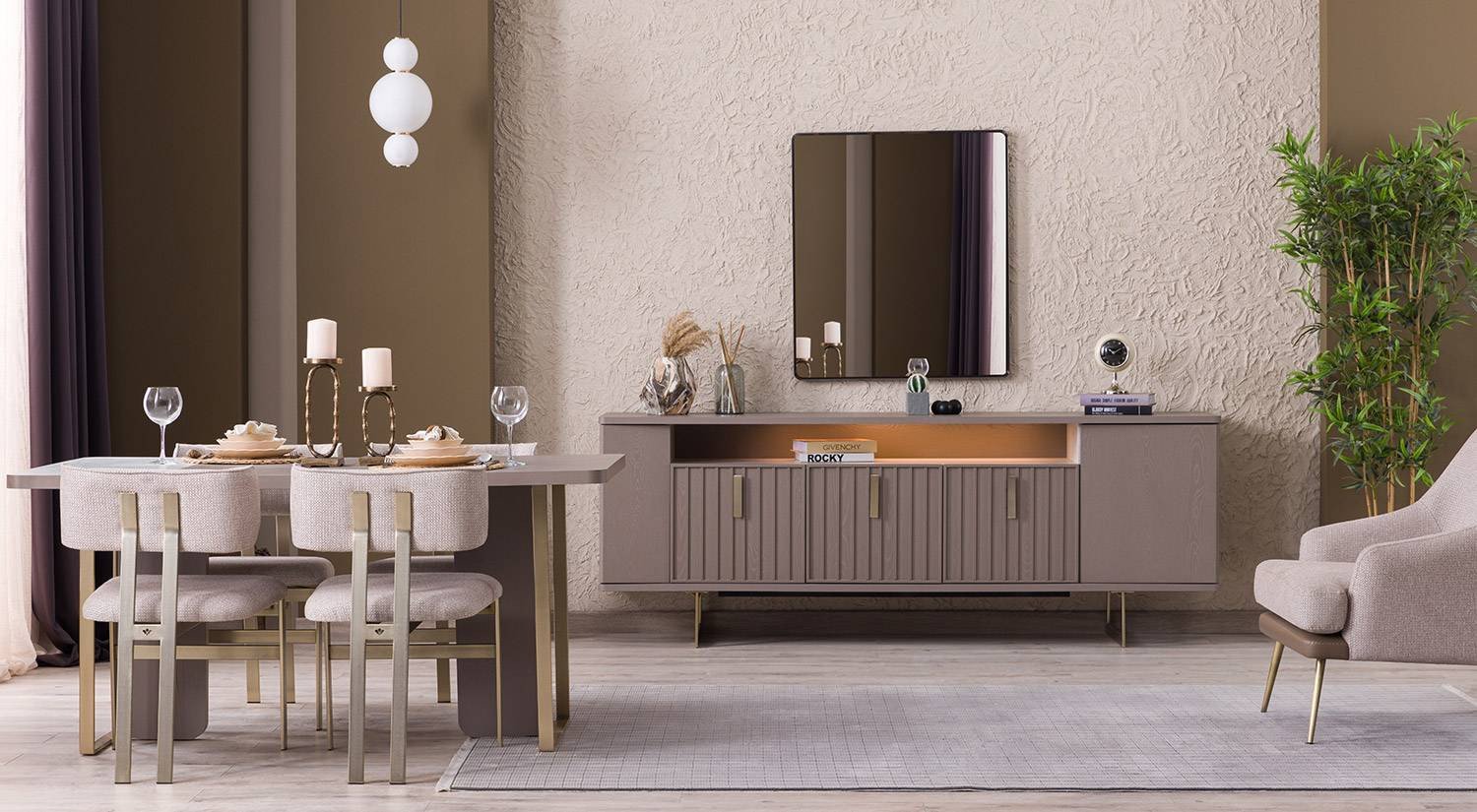 Latte Yemek Odası sade ve çağdaş hatlara sahip tasarımıyla salon yemek alanlarına estetik bir görünüm sağlar. Minimal detaylar dekorasyonla kolay uyum sağlar.