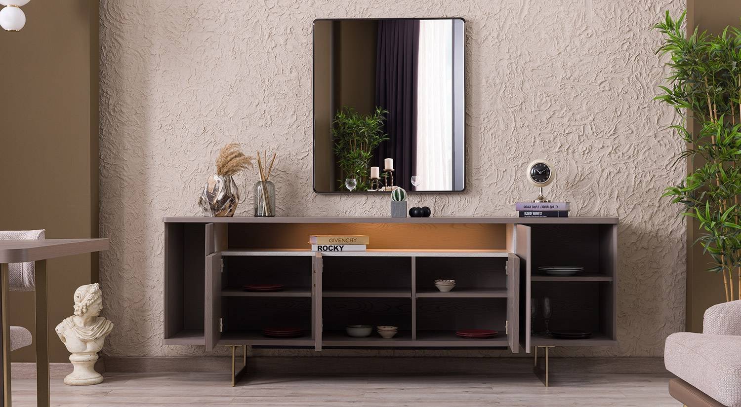 Takımda konsol alt blok, konsol aynası ve sabit yemek masası seçenekleri bulunur. Geniş konsol alt blok depolama alanı sunar; ergonomik sandalyeler ise konforlu bir oturum sağlar.