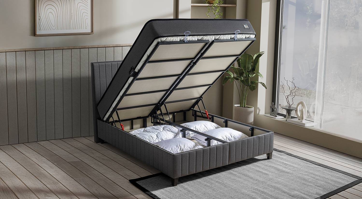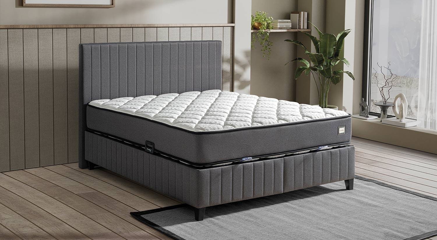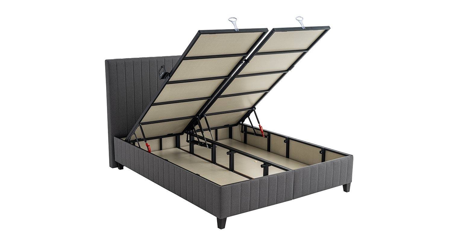 Set; yatak, baza ve başlıktan oluşur. Baza, depolama ve yükseltilmiş yatak sistemi sağlar; başlık ise konforlu destek ve estetik görünüm sunar.