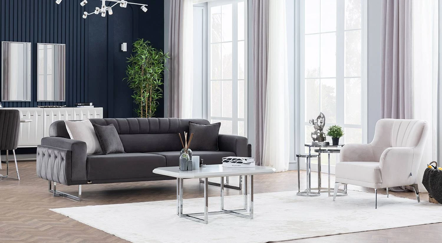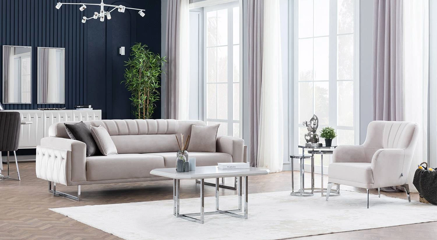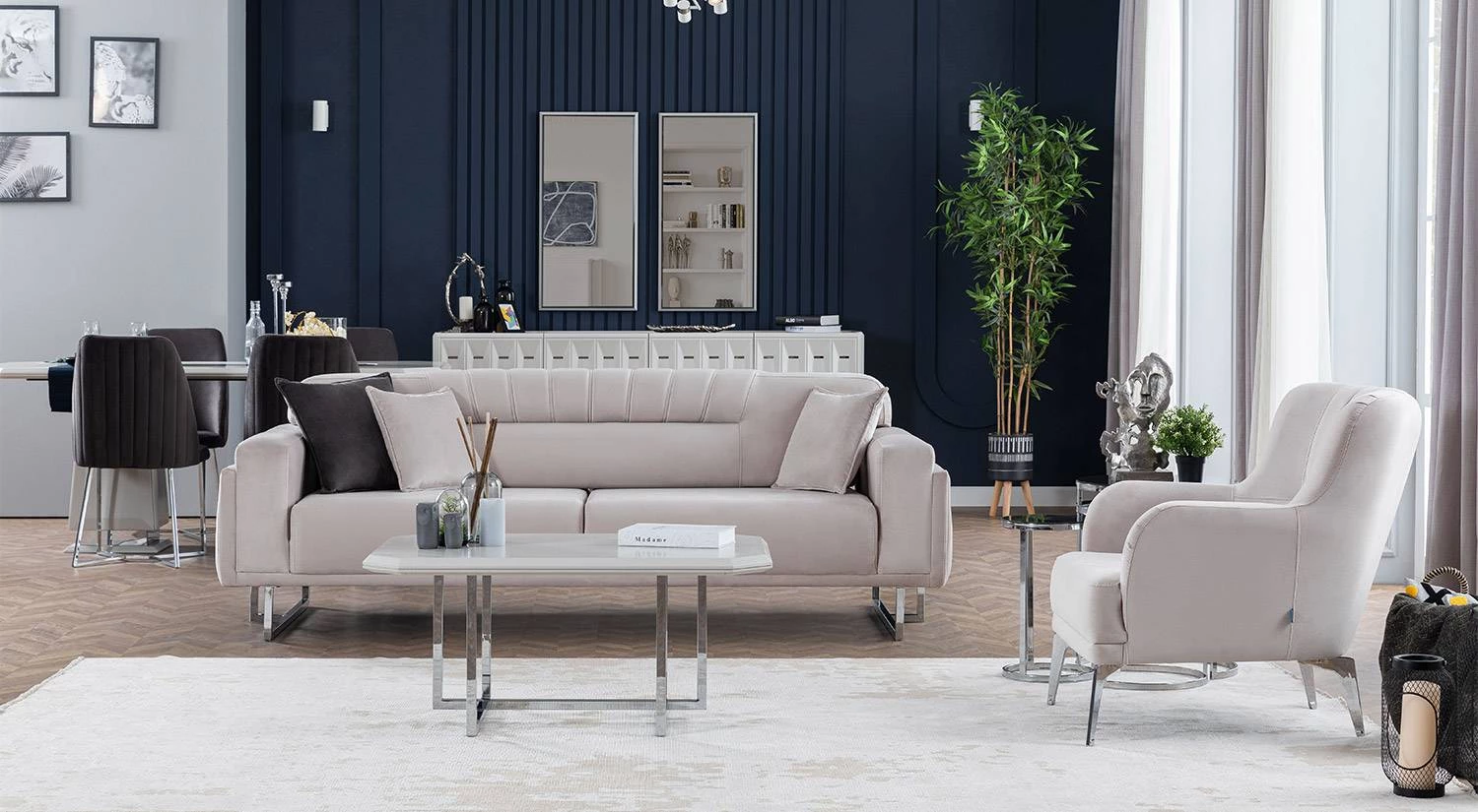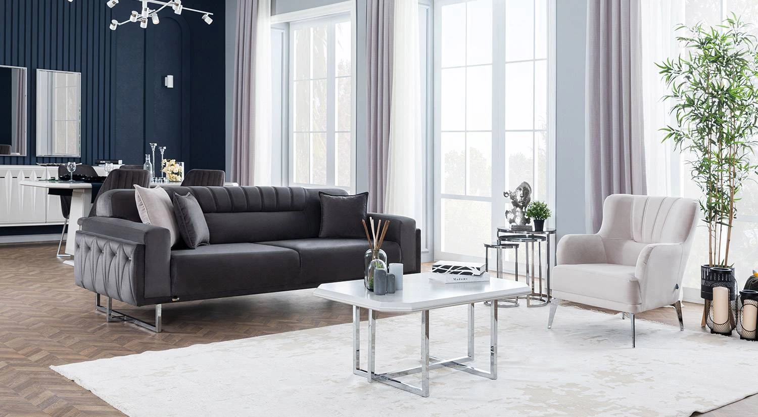 Natura Koltuk Takımı sade ama etkileyici modern çizgilerle tasarlanmıştır. Kadife dokusunun kattığı zarafet, farklı dekorasyon stilleriyle kolay uyum sağlar.