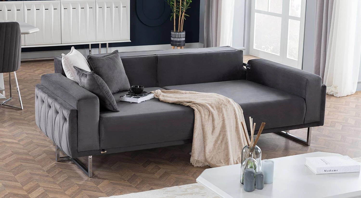 Natura Koltuk Takımı modülleri yatak formuna dönüşebilen mekanizmaya sahiptir. Bu özellik misafir ağırlamada ek kullanım avantajı sağlar.