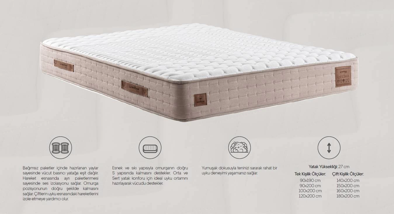 Optima yatakta bağımsız paketlerde yer alan yaylar sayesinde vücut basıncı eşit şekilde dağıtılır; bu sayede omurga doğru pozisyonda kalır, ses izolasyonu sağlanır ve çiftlerin uyku esnasında birbirlerinin hareketlerinden daha az etkilenir.