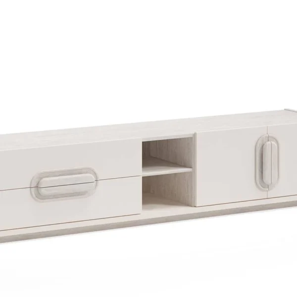Traverta Duvar Ünitesi, modern dekorasyon ve fonksiyonel depolama arayan kullanıcılar için uygundur. Taş dokulu estetik çizgisi ile salonunuza şıklık kazandırırken medya ekipmanlarınızı ve dekoratif objelerinizi düzenli bir şekilde sergilemenize yardımcı olur.